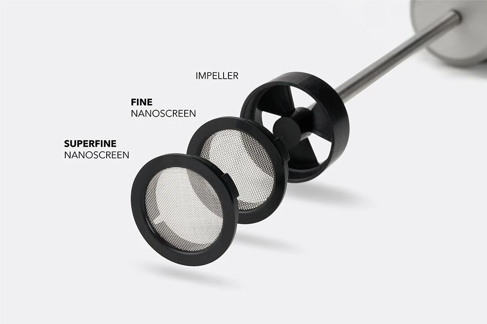 - NanoScreens: Two different nano-screens are included with the NanoFoamer. These create slightly different textured milk. Note that the NanoFoamer can also be used without a screen to create normal foam or for mixing drinks.